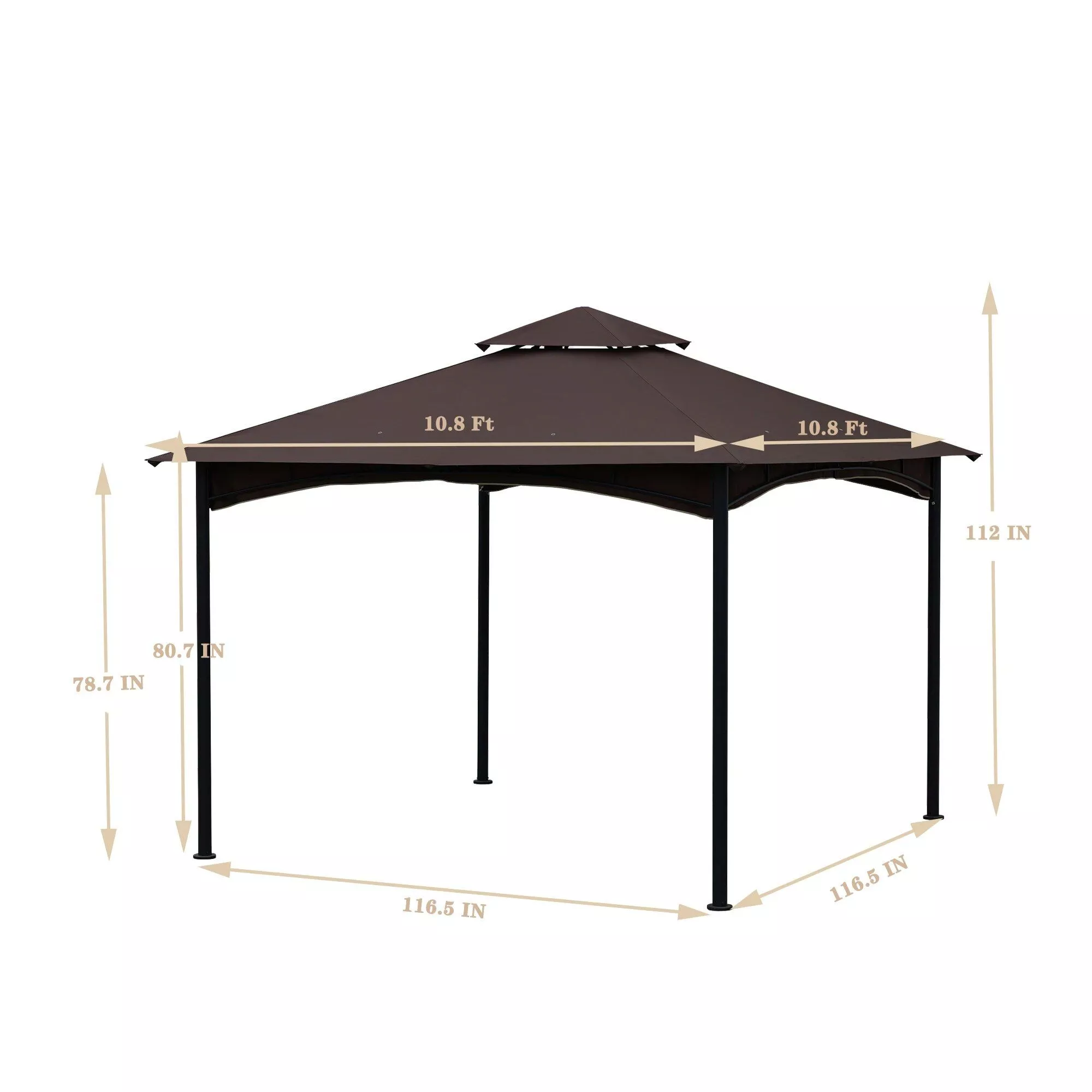 Customizable, with an umbrella radius of 48 inches and a total size of 11Ft x 11Ft x 9.35Ft, this gazebo is both spacious and adaptable to various outdoor settings. The frame’s black finish adds a touch of elegance, while the khaki/brown roof provides a natural, soothing shade. Weighing 74.5 lbs, it’s sturdy yet manageable.